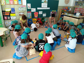 Después, hablamos de momentos en los que nos sentimos tristes. Uno de esos momentos puede ser cuando un familiar está enfermo. Así que, como la mamá de Julio es enfermera, nos enseñó junto a su compañera Vanesa cómo podemos ayudar en el caso de que un familiar se ponga enfermo de repente. Así, gracias a Estefania y Vanesa nos convertimos en verdaderos enfermeros y aprendimos cómo se hace una RCP (Reanimación Cardiopulmonar) utilizando nuestro muñeco y una canción que nos indicaba como tenemos que actuar y sobre todo nos recordó el número mágico que salva vidas...¡el 112! Además de aprender algo muy importante ¡lo pasamos genial!